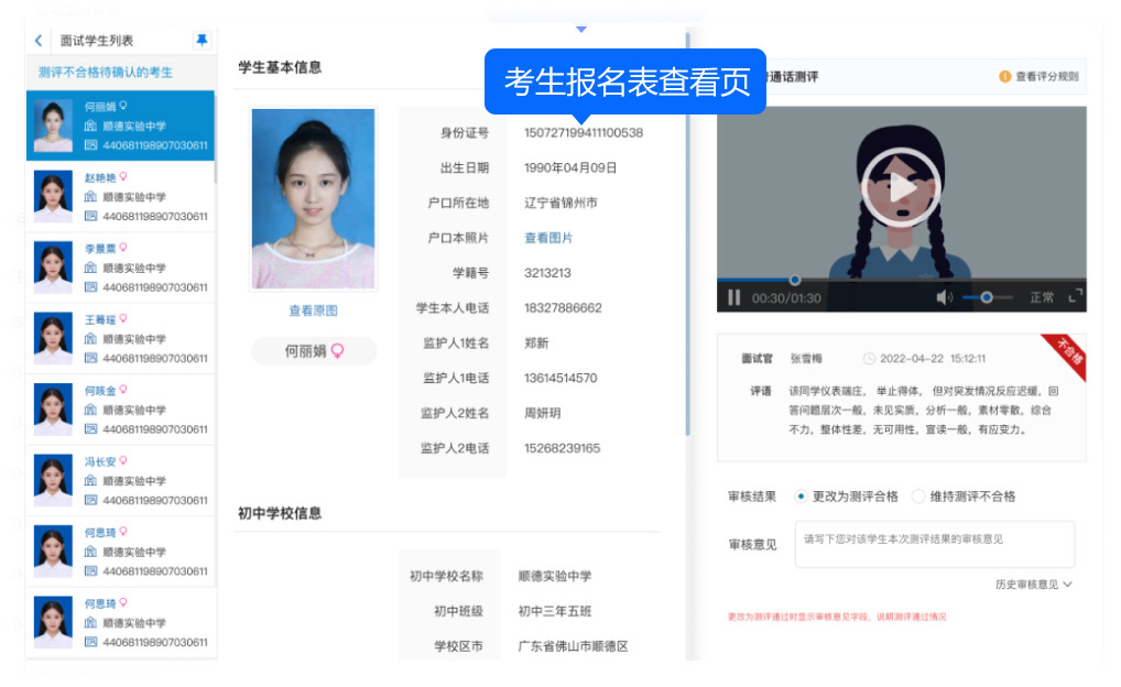 對于在任一測評項(xiàng)目評委試官初步評定為“不合格”的考生,其評分結(jié)果將自動(dòng)評委試官組長的復(fù)核流程。在復(fù)核階段,組長可全面調(diào)閱考生的相關(guān)資料,包括報(bào)名信息、流程信息、未通過的測評項(xiàng)目的視評委試官、測評結(jié)果及評語等信息,并支持錄入審核結(jié)果。