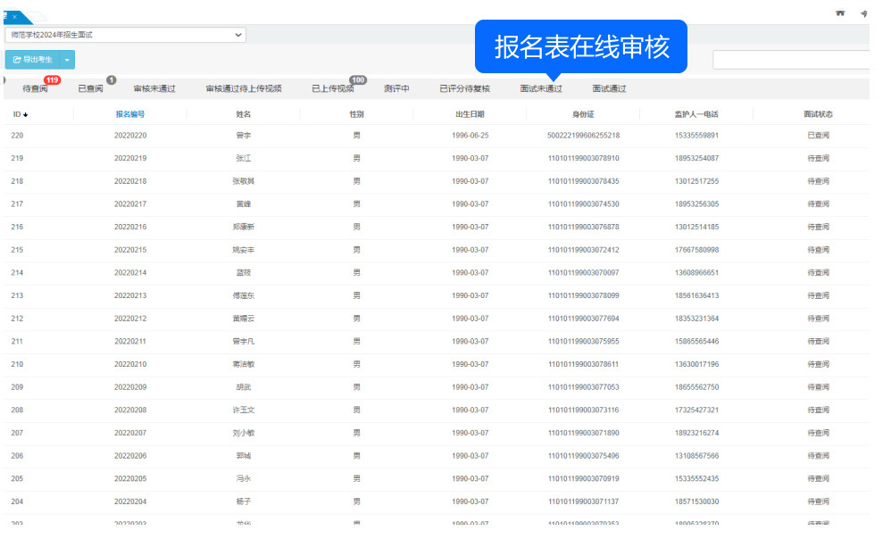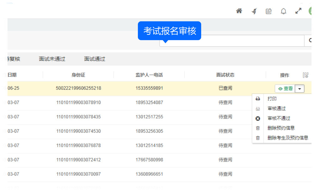 針對報(bào)名表的處理提供了豐富的操作選項(xiàng),包括查看報(bào)名表、審核通過、審核不通過、撤消審核不通過、打印報(bào)名表、刪除報(bào)名信息、刪除考生及報(bào)名信息等,并支持這些操作的批量處理,極大地提高了工作效率。查看報(bào)名表后自動(dòng)將狀態(tài)改為“已查閱”。